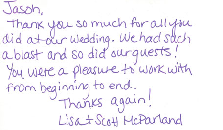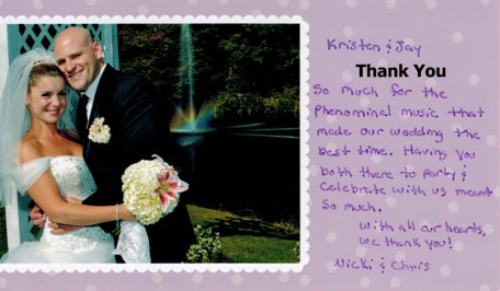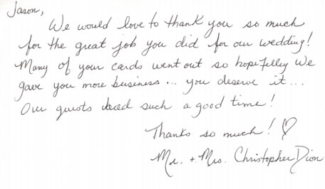 We would love to thank you so much for the great job you did for our wedding! Many of your cards went out so hopefully we gave you more business ...
