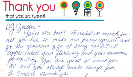 You're the best! Thanks so much for all you did to make our party special and for the generous gift of being our DJ. I appreciated your flexibility and your ...