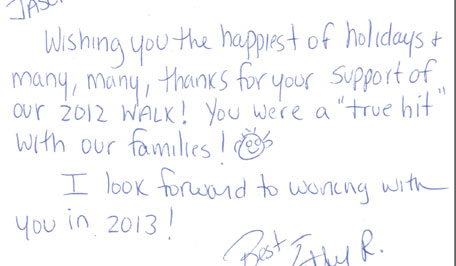 Wishing you the happiest of holidays and many, many thanks for your support of our 2012 walk! You were a "true hit" with our families!